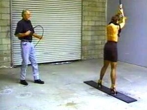Gorąca blondynka związana i zawieszona do góry nogami, zdominowana biczami